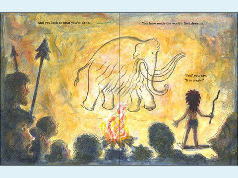 In The First Drawing, (Gerstein, 2013) the protagonist, a young child living in a cave thirty thousand years ago, has become frustrated that no one else can see the images in the shadows and jumps up and traces them out on the cave wall with a burnt stick. In that act, it is said, the child invented the first drawing. In the following, the red indicates the who or what that is doing the action.