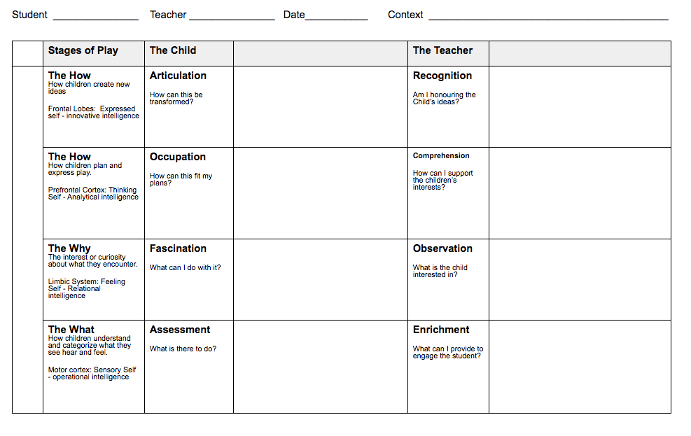 On the left it lays out stages of play. On the right it provides provocations to engage and scaffold the play, and if done right, without taking over the play. In the centre is described the cognitive actions that are being activated in the different stages. This is what I was looking for. But how do I utilize this knowledge other than in a passive, reflective way? How do I make the implicit explicit. For that I created the following document.